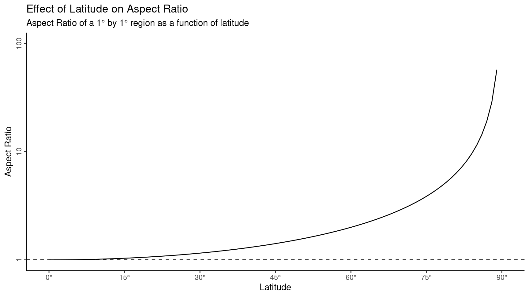 Let’s figure out the aspect ratio issue first. This arises because lines of longitude converge at the poles. As a result, a map with the same latitudinal and longitudinal extent, say 1° by 1°, looks very different at 60° latitude than it does at the equator.