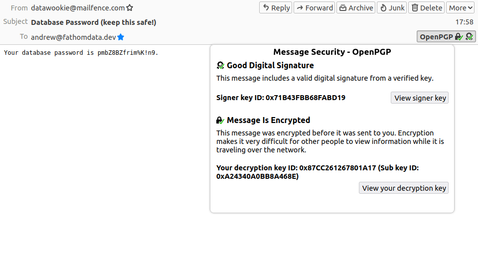 An encrypted message in Thunderbird email client.