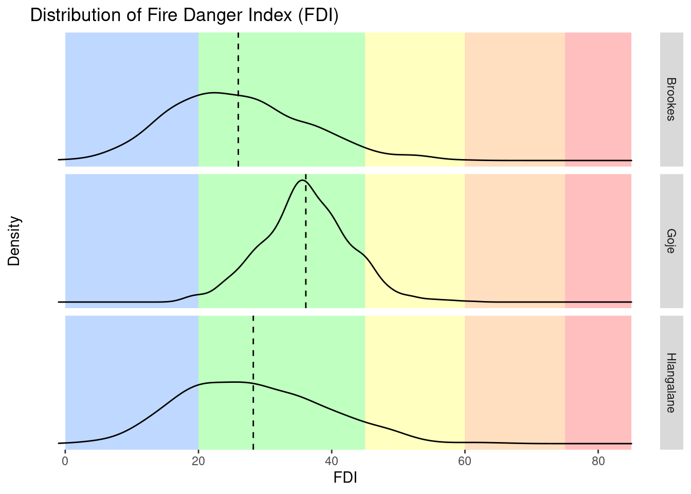 The distribution of FDI at each of the sites is given in the density plots below. The average FDI at each site is indicated by the vertical dashed line. FDI at Goje is significantly less variable than at the other two sites, being strongly peaked at a value around 35. FDI is more variable at Brookes and Hlangalane, but on average is lower than that at Goje.