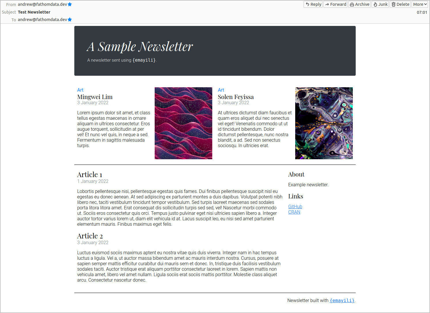As I mentioned earlier, this feature is still pretty fresh and I’ve no doubt that there are bugs. However, I’m very excited about what’s now possible. You can now replicate services like Mailchimp or MailerLite from within R. The only constraints are your imagination and aesthetics (and I’m sorely lacking in the latter). If you create a template which you’d like included in {emayili}, please swing it my way.