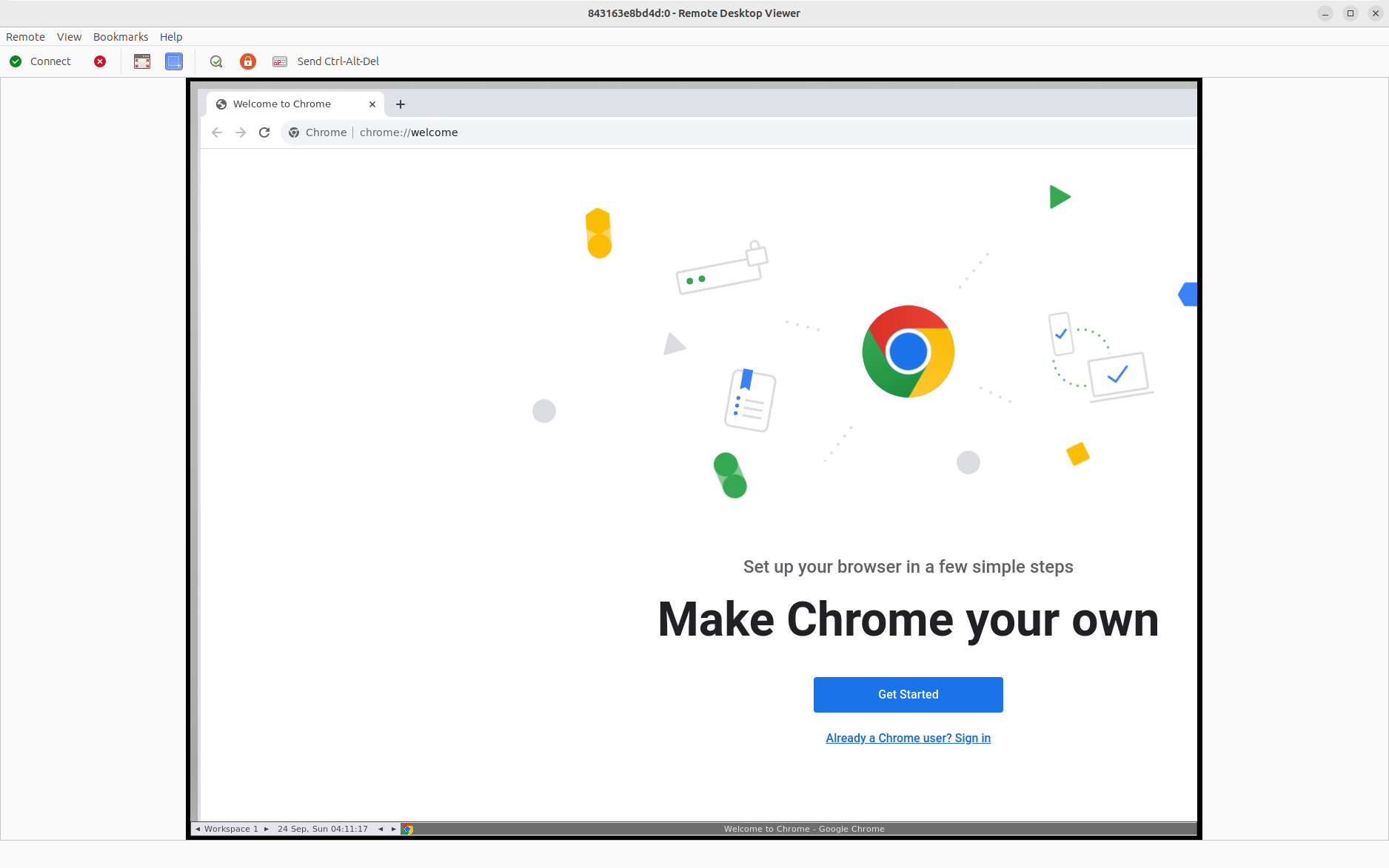 driver = uc.Chrome()Now the browser is still locked up inside the container. We need to use a VNC client to see it. Open 127.0.0.1:5900 in the client. In the image below you can see the Chrome browser in a Vinagre remote desktop window.