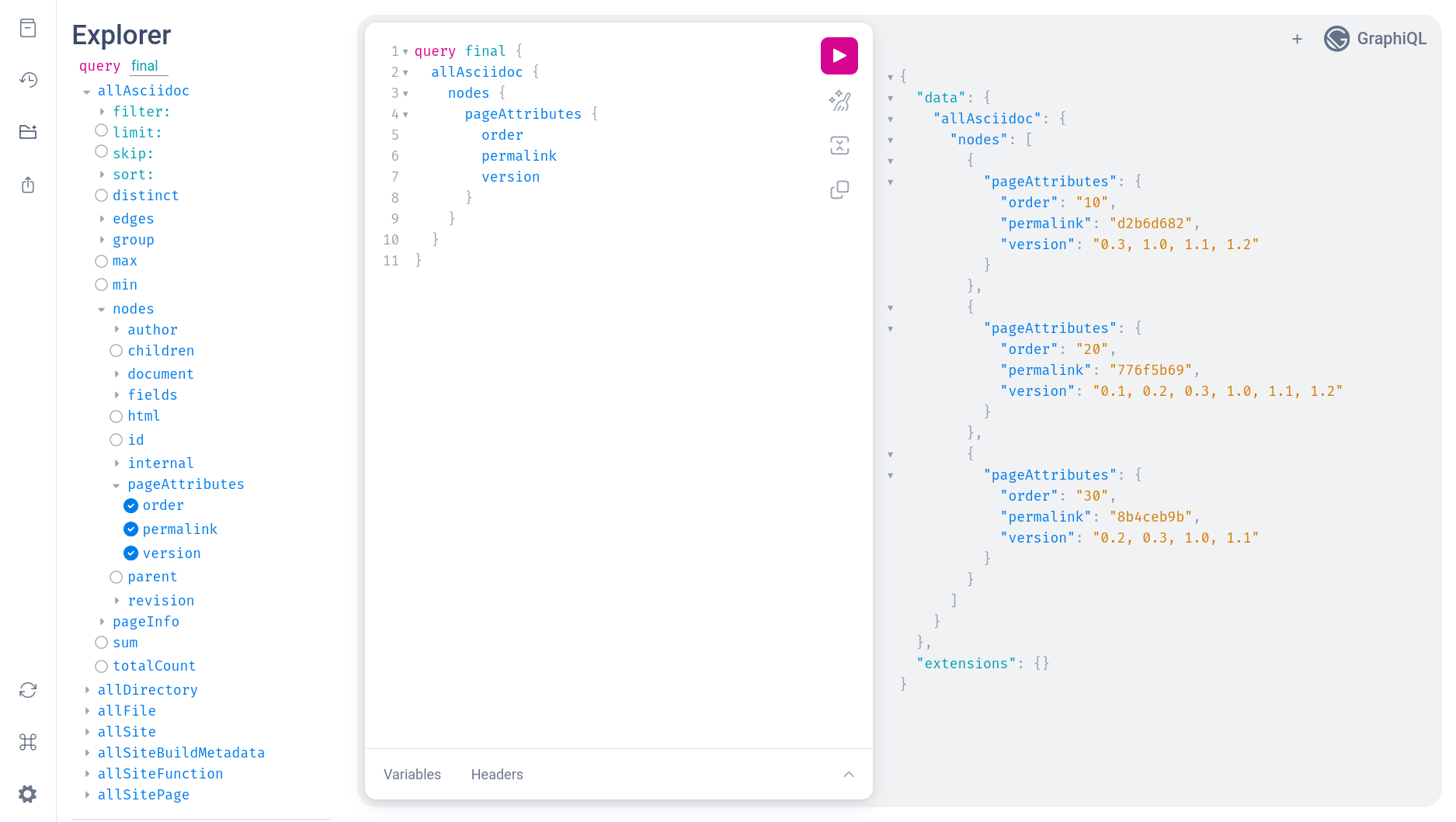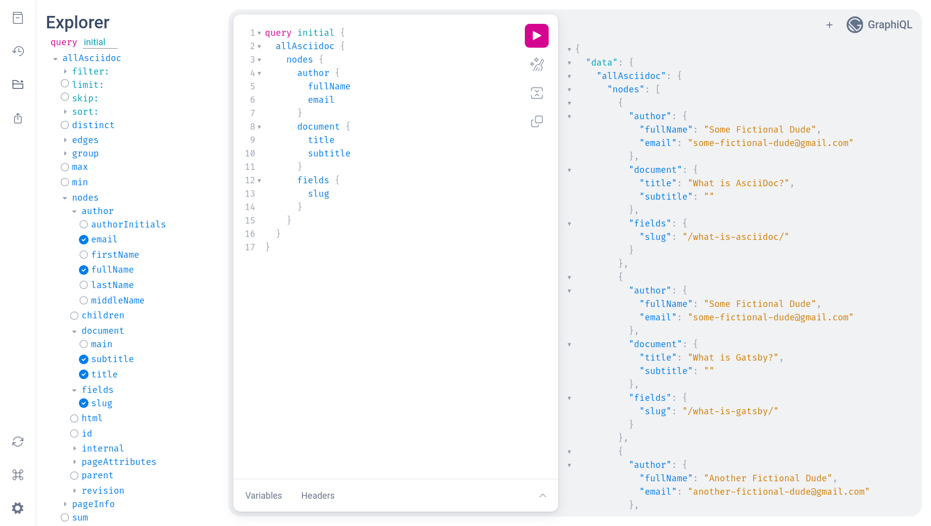 Taking a look at the GraphQL content accessible under allAsciidoc we see that there is metadata pertaining to the author, the title and subtitle of the post. There’s a slug field, which determines the appropriate page URL. There’s also revision information (but this is not included in the query above, although it’s visible at the bottom of the Explorer panel).