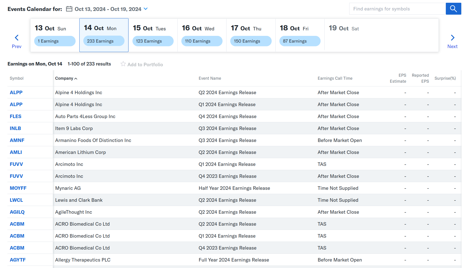 The data were scraped from the Company Earnings Calendar on Yahoo! Finance.