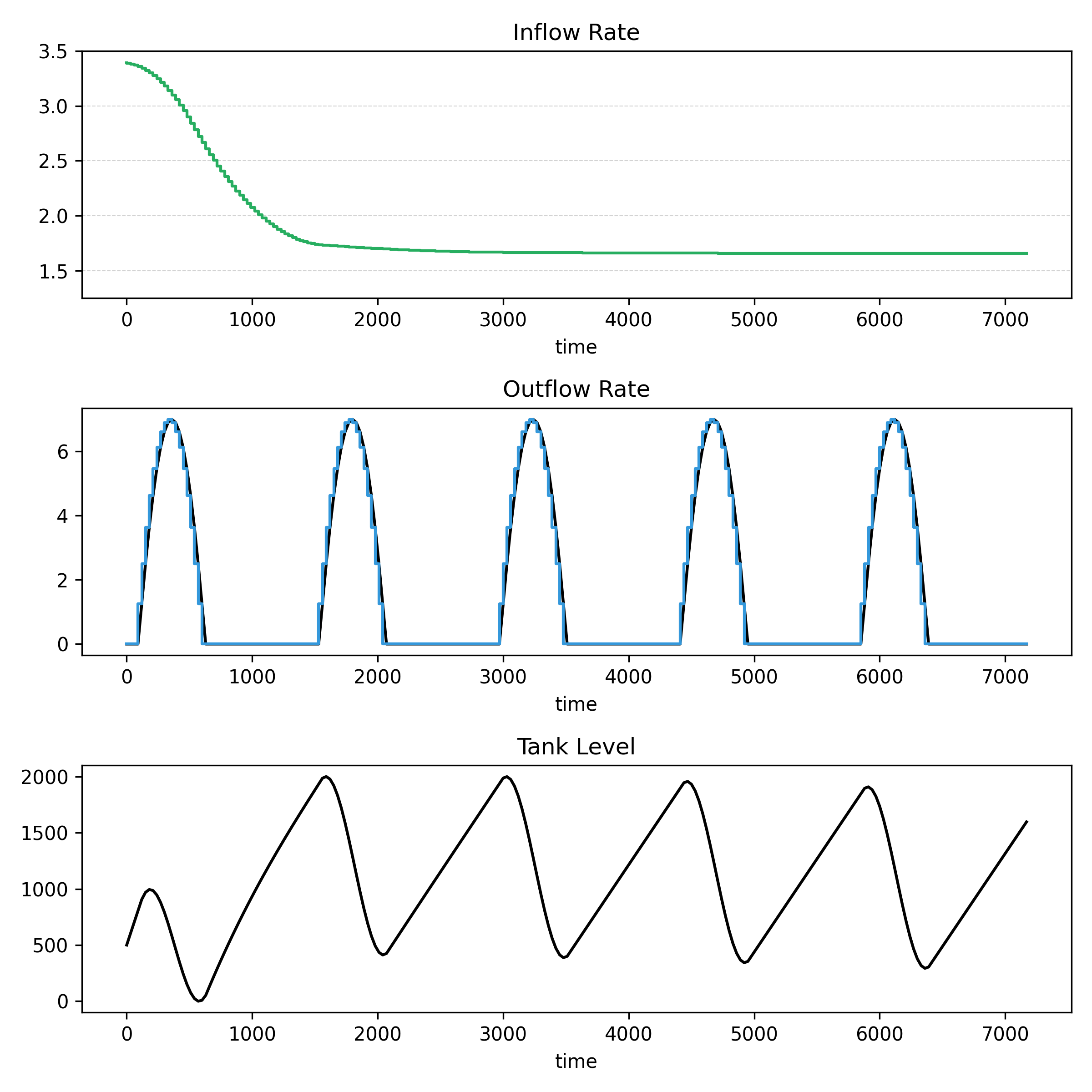 Compared with the results from the CVXPY package the optimised inflow rate is similar: high initial flow rate, then decreasing to a lower flow rate after the first demand cycle. The inflow here is, however, a smooth function of time. This is objectively a better solution since it corresponds to a lower value of the objective function. It’s also more aesthetically pleasing. Whereas with CVXPY the smoothing term in the objective function seems to have had no effect on the input flow, here it has achieved its goal. The optimised outflow rate closely matches the demand and the tank level is a periodic sawtooth as before.