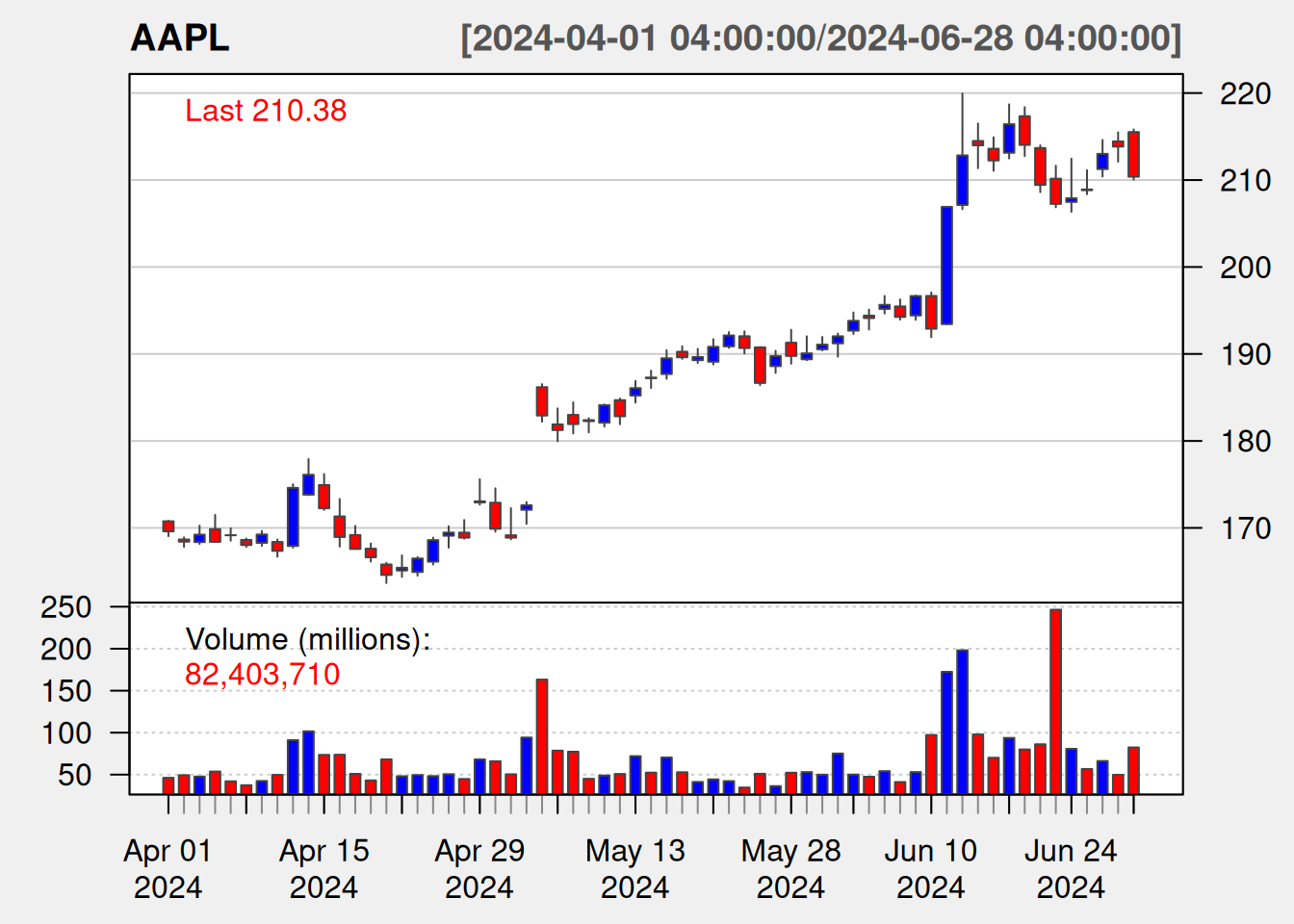 How about a longer series of data at daily resolution? Let’s get AAPL for the second quarter of 2024.