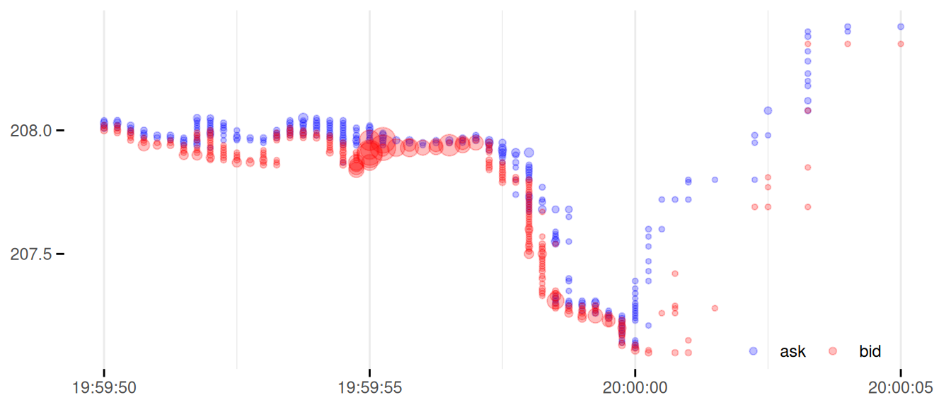 I’m not sure about the best way to present these data. Below is an example of something that I’m experimenting with, which shows the individual quotes as points. The vertical axis reflects price. The points have 25% opacity, so multiple quotes will build up the colour. The size of the points scales with the quote size. The side is encoded by colour, with bid in red and ask and in blue. I added a quotes_tidy() utility function that will transform the data into a form suitable for generating this plot.