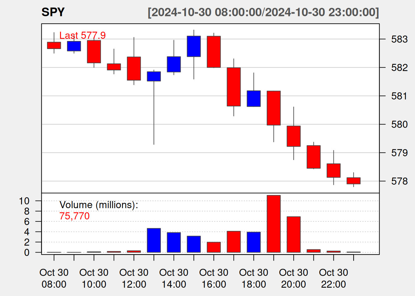 SPY <- bars("SPY", "1H", "2024-10-30", "2024-10-31")
