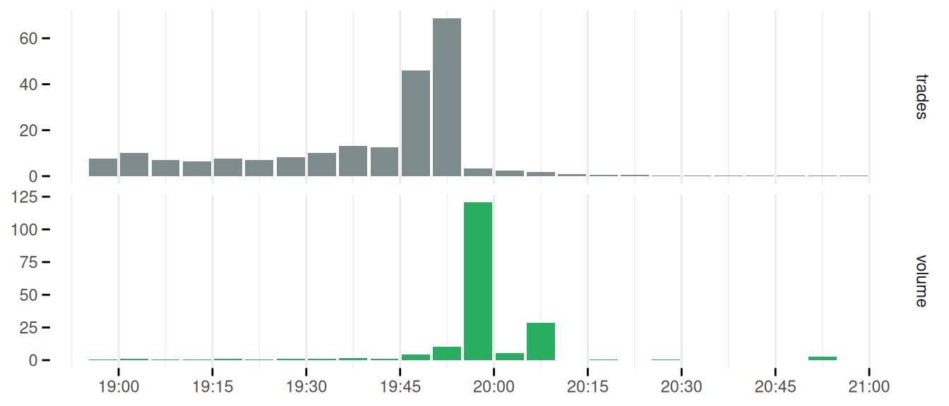 A similar pattern emerges, with the number of trades escalating until the 19:50 bar, before dropping in the 19:55 bar, where the volume peaks.
