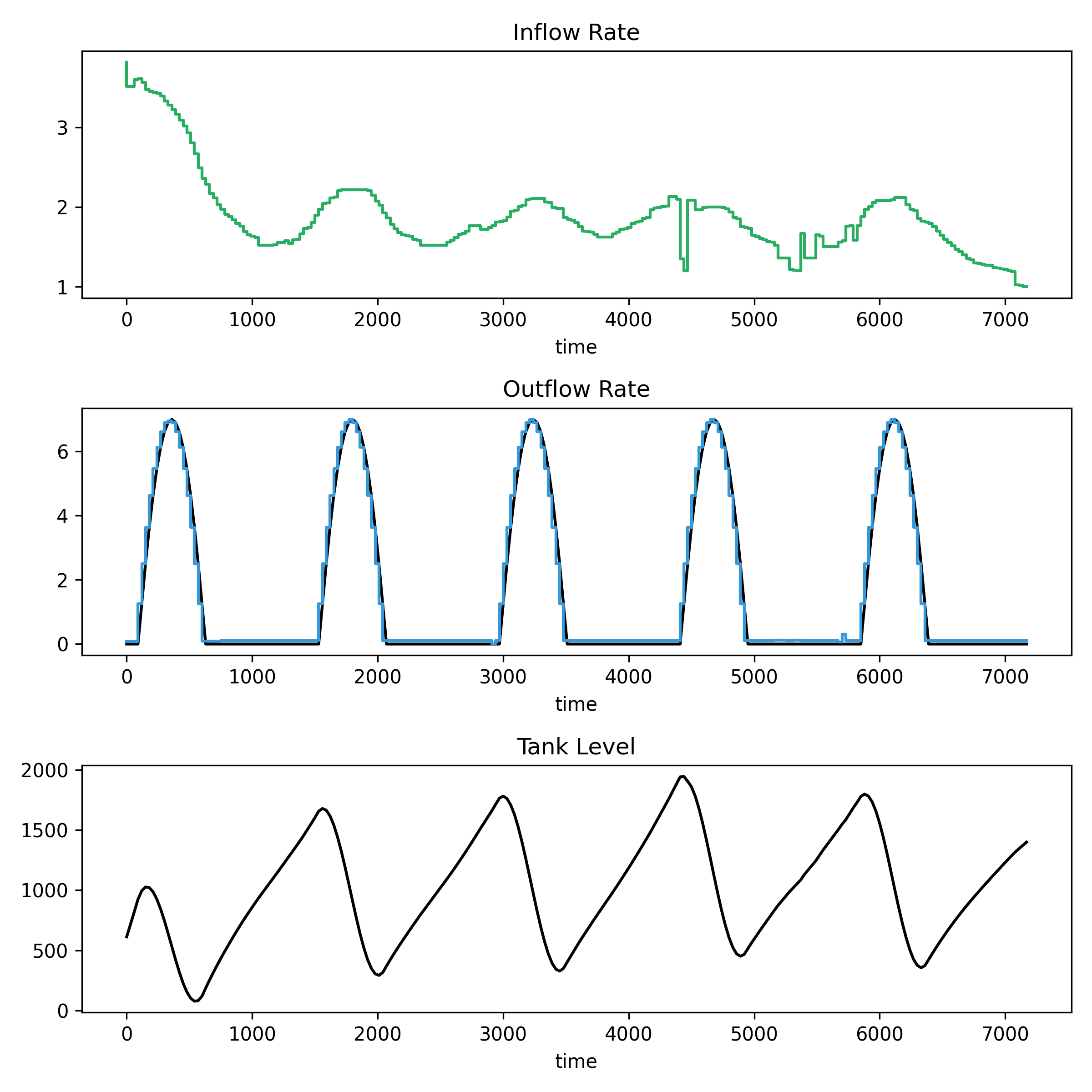 The top panel shows the inflow rate. The second panel shows the outflow rate (blue) and demand (black). The third panel shows the tank level.