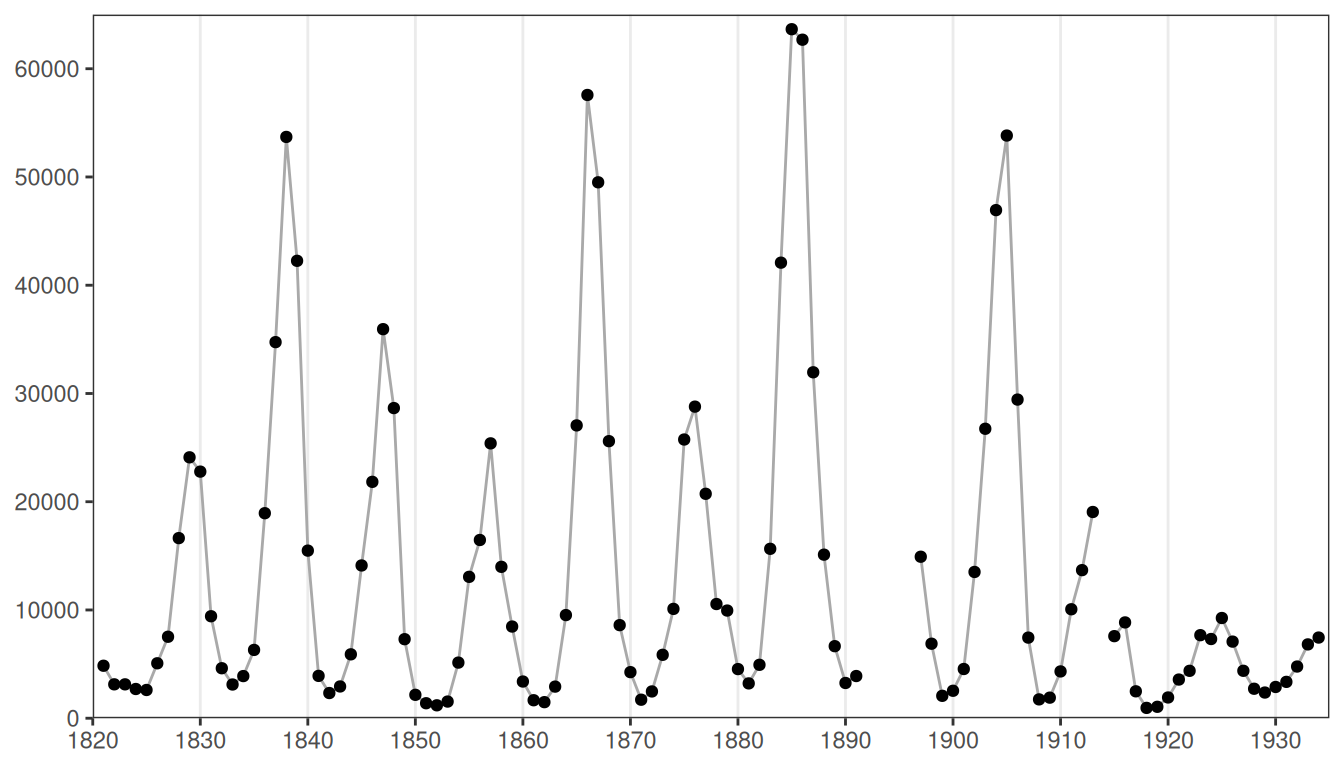 What causes the regular variation in lynx numbers? Food. The lynx is a fussy eater, with a preference for specific prey: either the snowshoe rabbit or a few varieties of hare. There’s a close predator-prey feedback loop between the number of lynx and the availability of their preferred prey. At the top of the lynx poplulation cycle there’s an abundance of predators. Lots of predators require lots of food. This impacts the population of the rabbits and hares, which start to decline. With less food around times are tough for the lynx and their numbers start to drop. As the lynx population decreases things become easier for the prey, whose numbers start to grow again. More prey causes the lynx population to recover. And the cycle begins again.