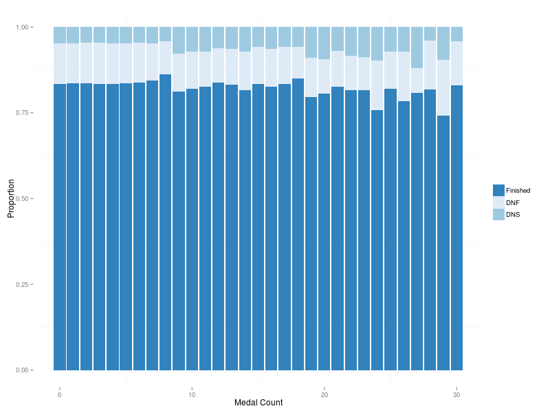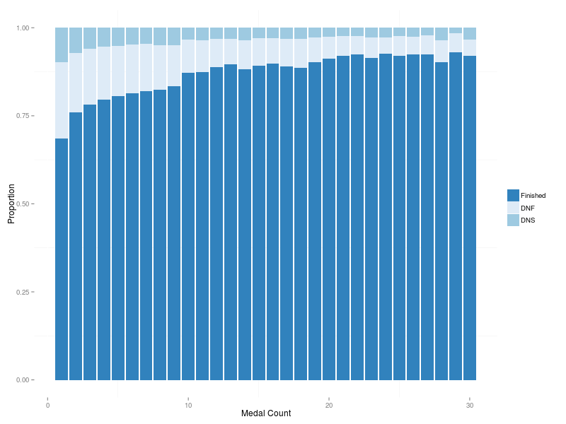 Wow! Now that is interesting. Just to be sure that everything is clear about this plot: every column reflects the proportions of finishers, DNFs and DNSs who already had a given number of medals. Some intriguing things in these data: