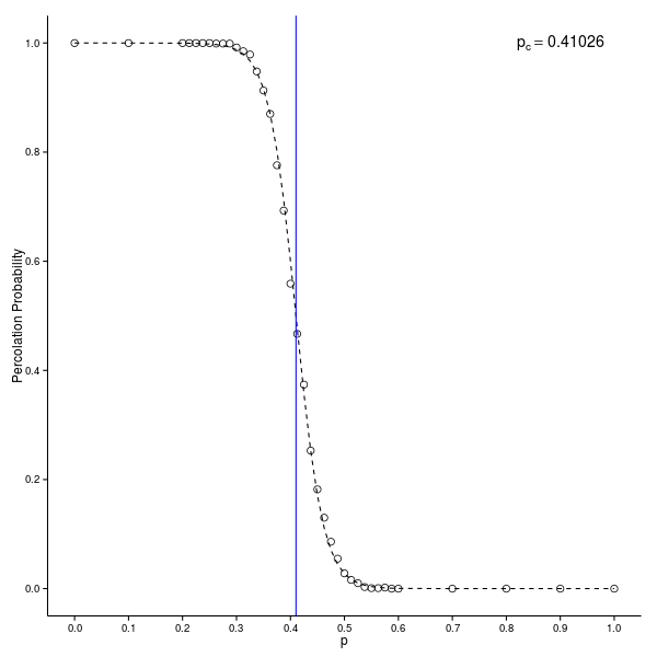 }Summary statistics are then compiled to give the percolation probability as a function of p.