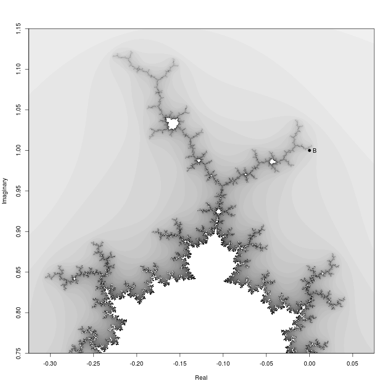 image(x, y, zoom.mandelbrot, col = rev(gray.colors), useRaster = TRUE, xlab = "Real",