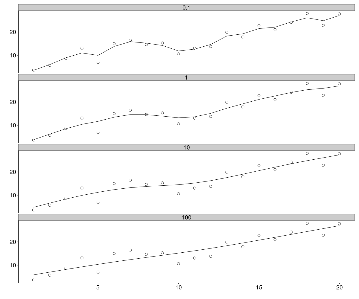 A plot is the most sensible way to visualise the effects of \(\). Below the original data (circles) are plotted along with the filtered data for values of \(\) from 0.1 to 100. In the top panel, weak regularisation results in a filtered signal which is not too different from the original. At the other extreme, the bottom panel shows strong regularisation where the filtered signal is essentially a straight line (all curvature has been removed). The other two panels represent intermediate levels of regularisation and it is clear how the original signal is being smoothed to varying degrees.