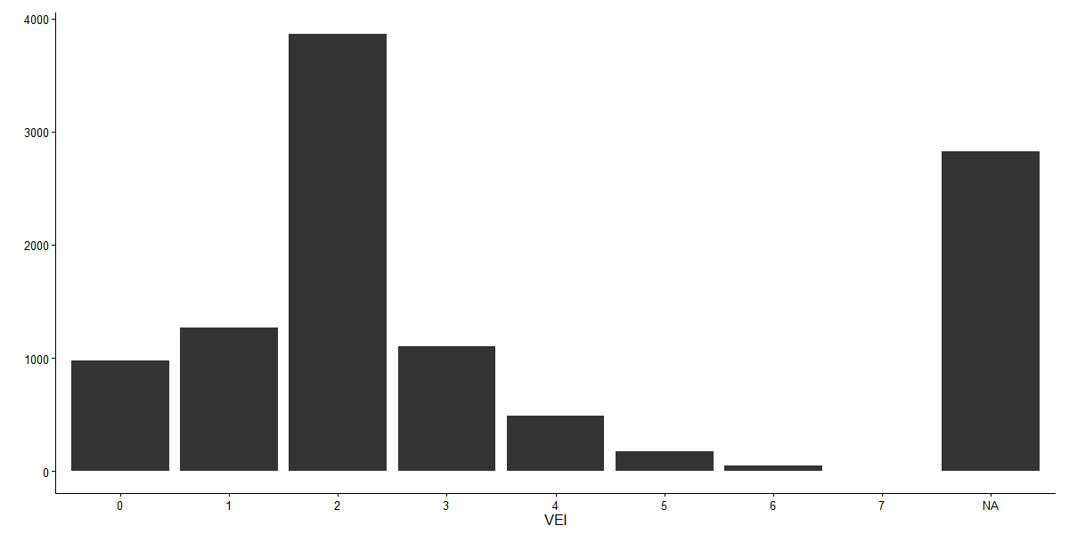 theme_classic()We see that the vast majority of eruptions have VEI of 2, which means that they eject between 0.001 and 0.01 km3 of ash and lava.