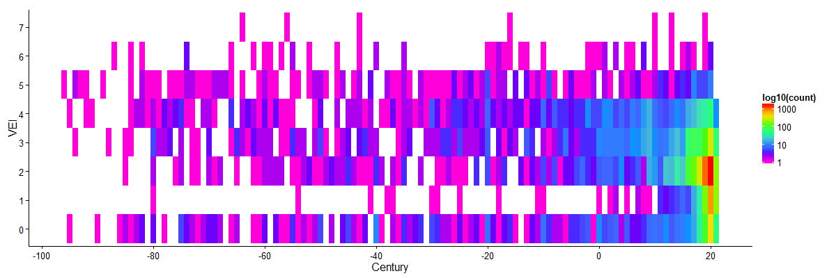 A tiled plot of counts versus VEI and century gives a good view on the data.