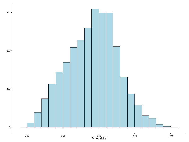 The eccentricity histogram above shows that there are few objects on circular orbits. Although there are a few objects with extremely elliptical orbits, the majority have an eccentricity somewhere around 0.5.