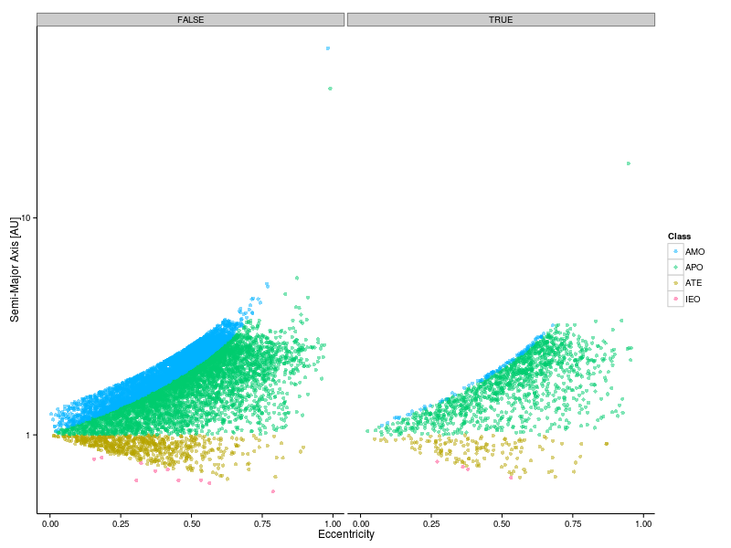 We can make these data more illuminating by including the length of the semi-major axis. We will also indicate the class of the object (colour scale) and whether or not it is potentially hazardous (left and right panels).