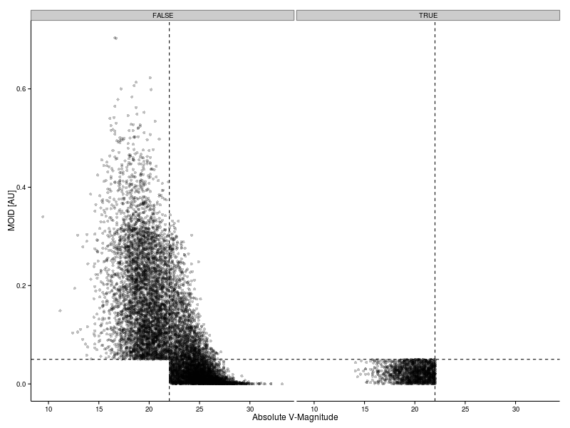 Here we can see that the orbital parameters for the four different classes are well differentiated and that we should be able to easily classify a new object. There does not seem to be a clear distinction between objects which are or are not potentially hazardous. Why is that? Objects are considered hazardous if (i) they are likely to make a close approach to the Earth and (ii) are large enough to cause significant devastation. Effectively an object is defined as hazardous if it has a MOID of 0.05 AU (approximately 20 times the distance between the Earth and the Moon) or less and absolute magnitude less than 22 (approximately 150 m in diameter). This distinction is clarified in the plot below.