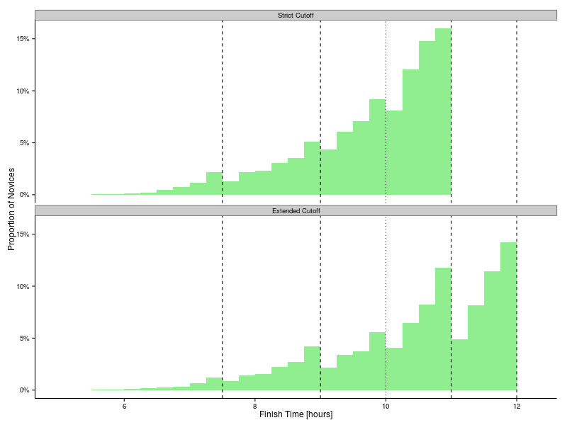 This paints a much more representative picture of the distribution of finish times now that the race has been extended to 12 hours.