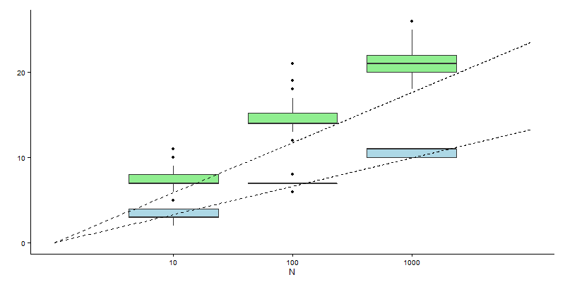 Since we have all of the infrastructure in place, we can conduct an independent test of the relationships. Below is a boxplot generated from 100 realisations each of calculations with generations of size 10, 100 and 1000. The blue boxes reflect our estimates for \(T_n\), while the green boxes are the estimates of \(U_n\). The two dashed lines reflect the asymptotic relationships. There’s pretty good agreement between the theoretical and experimental results, although our estimates for \(U_n\) appear to be consistently larger than expected. The sample size was limited though… Furthermore, these are asymptotic relationships, so we really only expect them to hold exactly for large generation sizes.