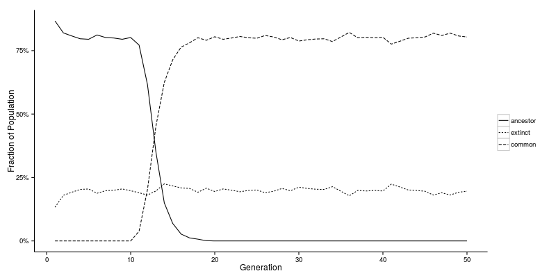 The graph used to generate these data had 1000 individuals per generation. We can see that for the first 10 generations around 80% of the individuals were ancestors of one or more (but not all!) of the current generation. The remaining 20% or so were extinct. Then in generation 11 we have the first CA. This individual would be labelled the Most Recent Common Ancestor (MRCA). Going further back in time the fraction of CAs increases while the proportion of mere ancestors declines until around generation 19 when all of the ancestors are CAs.