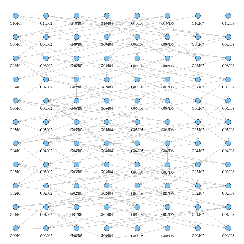 }Let’s give it a whirl on a graph consisting of 10 ancestor generations (11 generations including the current generation) and 8 individuals per generation. The result is plotted below with the oldest generation (G10) at the top and the current generation (G00) at the bottom. The edges indicate parent/progeny links.