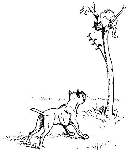 A simple black and white picture of a dog chasing a cat up a tree.