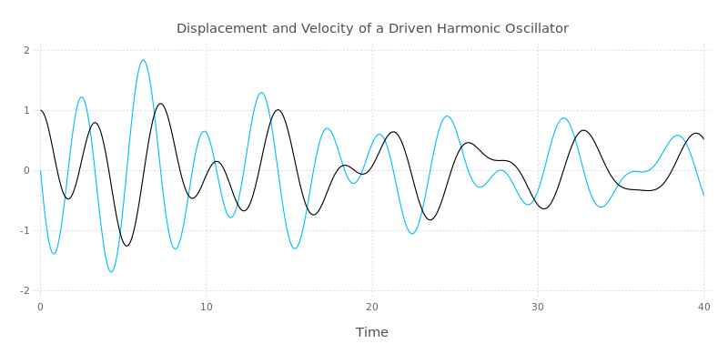 using ODEAgain we need to define a function to characterise our differential equations. The form of the function is a little different with the ODE package: rather than passing the derivative vector by reference, it’s simply returned as the result. I’ve consider the same problem as above, but to spice things up I added a sinusoidal driving force.