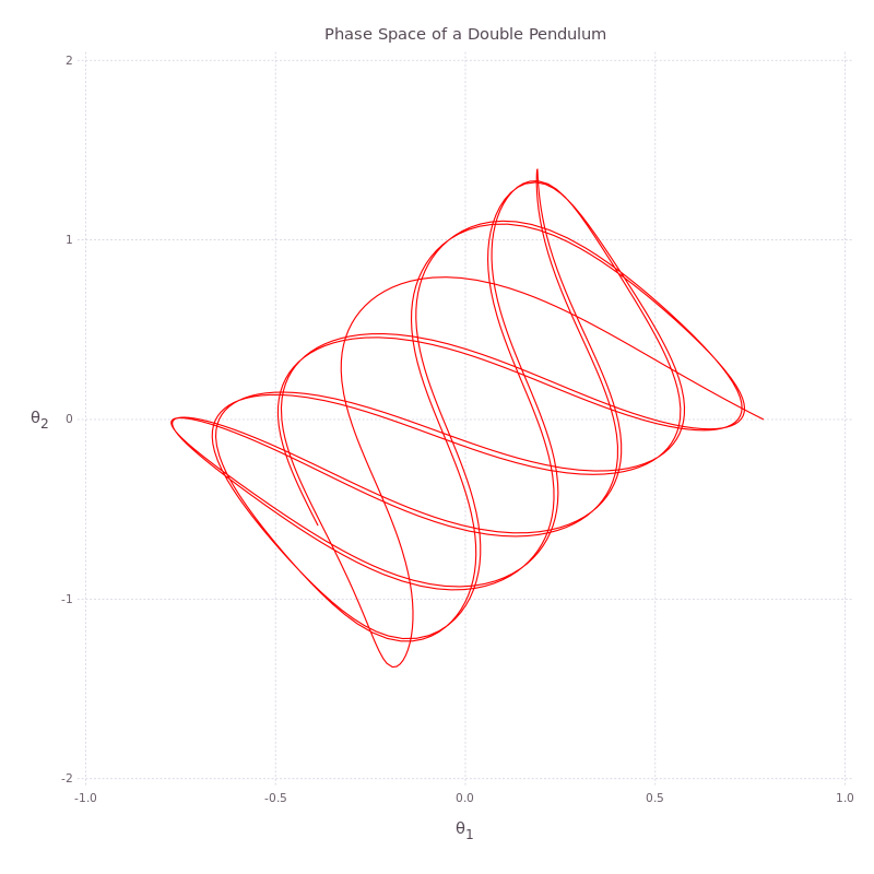 Below are two plots which show the results. The first is a time series showing the angular displacement of the first (black) and second (blue) mass. Next is a phase space plot which shows a different view of the same variables. It’s clear to see that there is a regular systematic relationship between them.