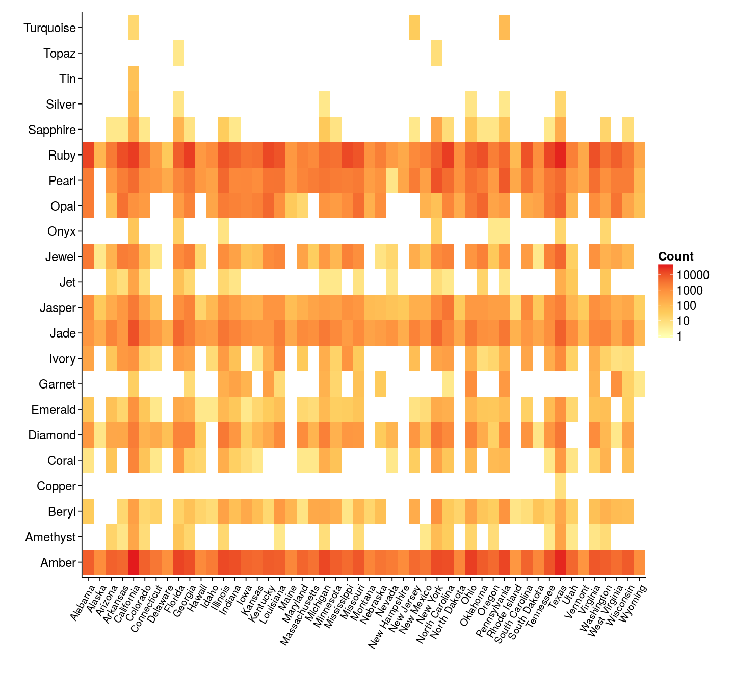 Names of precious gems and a few metals have also been used as given names. Ruby and Amber are rather popular across all states. Tin has been used 59 times (but only in California), while 8 children have been named Copper (but only in Texas). California and Texas are the most adventurous, employing the widest variety of names in this category.