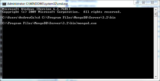 At this stage you should be ready to roll. Open another command prompt and start the database client, mongo.exe which you’ll find in the same folder as mongod.exe.