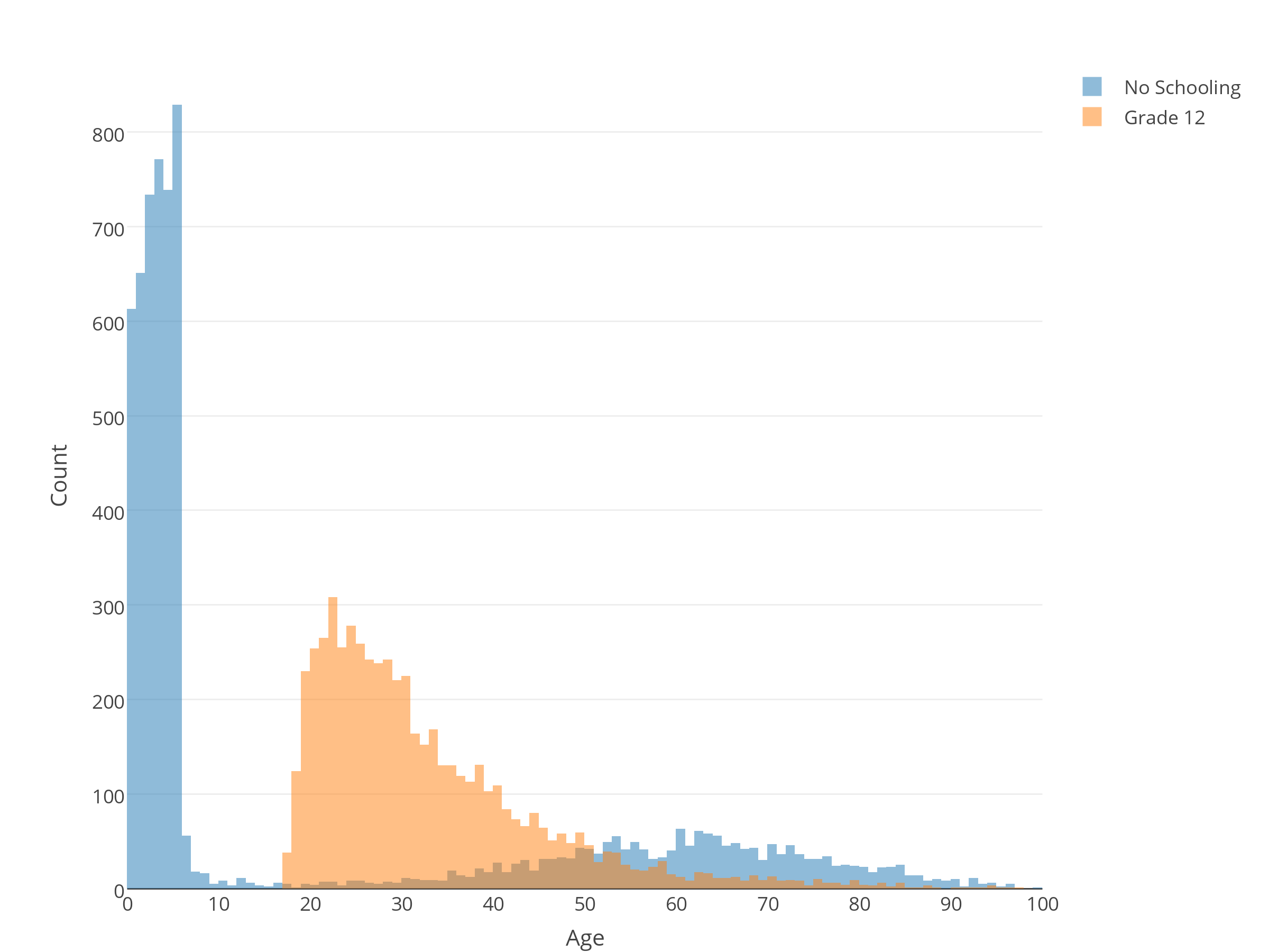 The data above show the distribution of ages in a segment of the South African population who have either no schooling (blue) or have completed Grade 12 (orange). Click the image to access the interactive plot. Being a subset of the complete data set, this does not tell the full story, but it’s still a rather interesting view on the state of education in South Africa.