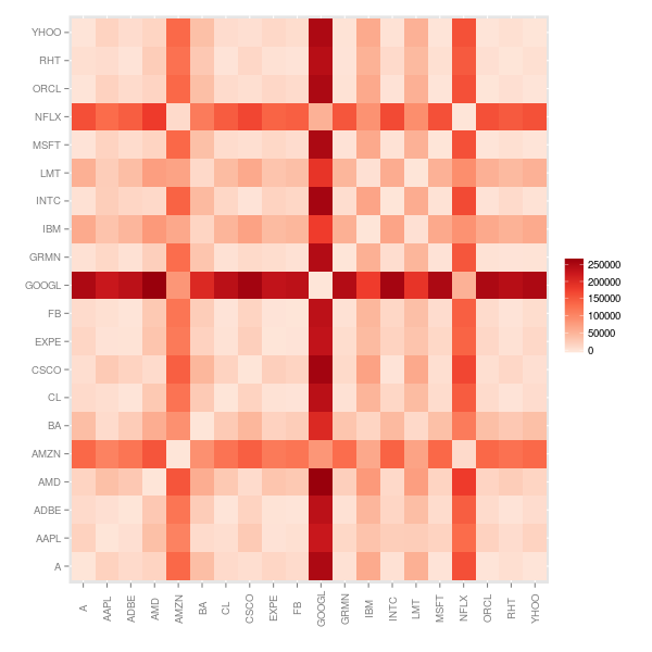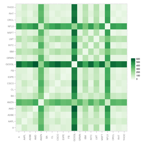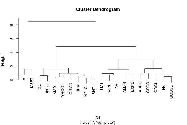Note that, since this is a measure of dissimilarity, the range of correlation has been shifted from [-1,1] to [0,2]. To get an idea of what the dissimilarity data look like, we’ll look at a mosaic plot. There appear to be blocks of similar stocks. For example, INTC, LMT and MSFT are not too dissimilar to each other. They are also not dissimilar to CSCO, EXPE or FB. But they are very different to AMD and AMZN.
