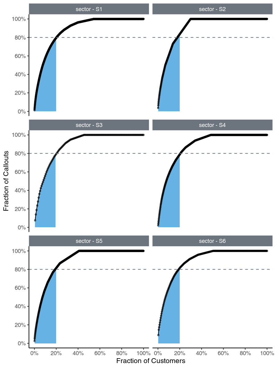 It’s evident that the Pareto Principle does indeed apply: the shaded area covers the top 20% of customers, who accoun—t for almost precisely 80% of the callouts.