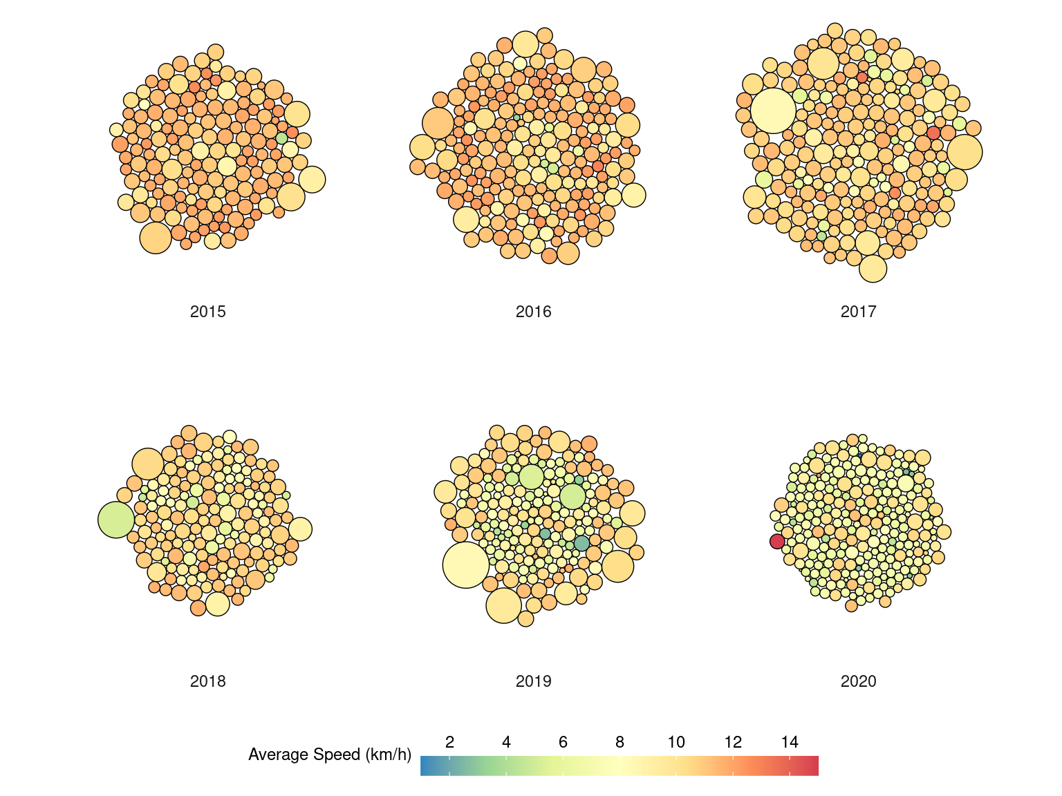 Finally, runs as packed circles, with distance mapped to circle area and speed as fill colour.