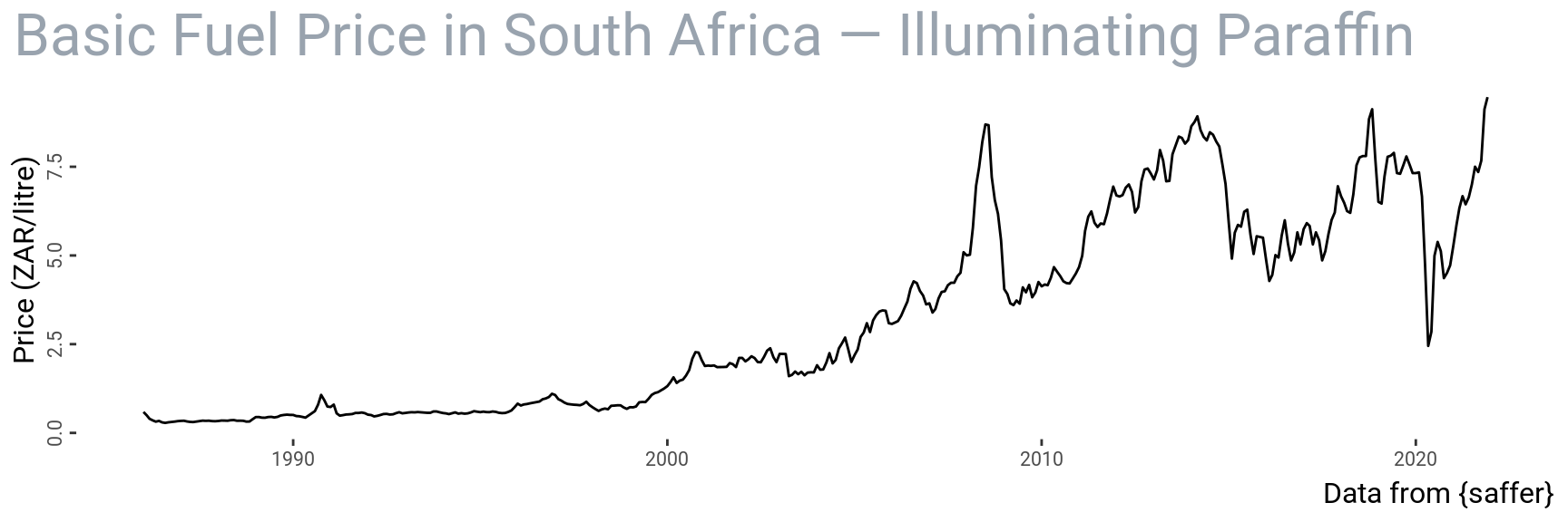 The {saffer} package is a nascent collection of things relating to South Africa. I’ve just added fuel price data.