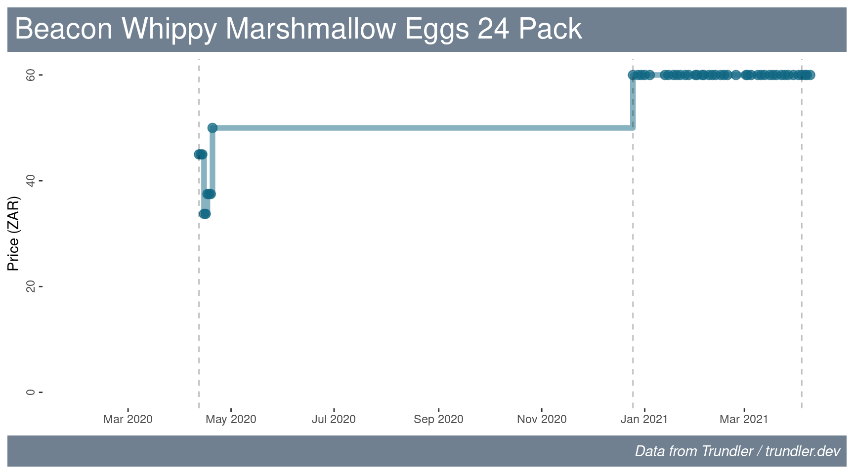 If you have a passion for praline then perhaps a bag of mild chocolate and praline eggs would appeal? It looks like there was a lot of stock after Easter 2020, which got progressively cheaper. This year the price has gone up by 30% (R59.99 versus R45.99).
