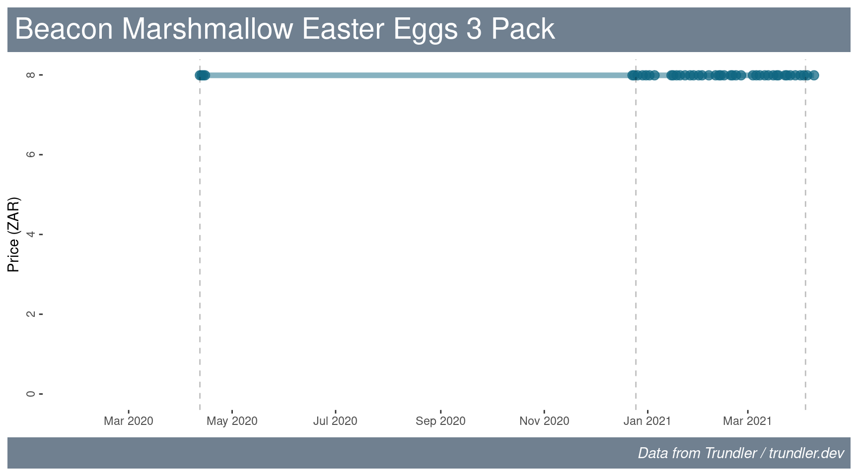 The plots below show the price history for each of the products that we’re looking at. Points indicated individual price records. The vertical dashed lines indicate the dates for Easter 2020, Christmas 2020 and Easter 2021.