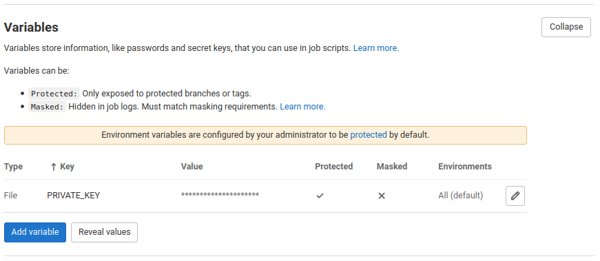 - docker push $TAG_LATESTThe content of id_rsa is stored in a CI/CD file variable called PRIVATE_KEY. This file is copied across into the Docker build context before the image is built.