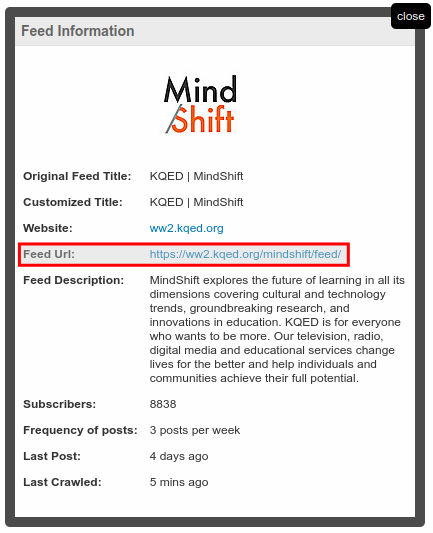 We haven’t actually gone to the selected feed. We’re simply on the page for that feed on Feedspot. We’re making progress, but we’re not there yet. To get the feed URL you’d need to press the “Feed Info” link, which would pop up a modal dialog. The URL that we’re looking for is https://ww2.kqed.org/mindshift/feed/. That’s the actual information that we’re after. But we had to jump through a number of hoops to get at it. If we were gathering a few hundred URLs, then this would translate into a lot of boring, repetitive work.