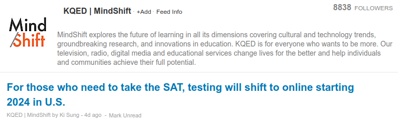 If we were interested in the “KQED | MindShift” feed then we’d click on the orange “Follow RSS”.