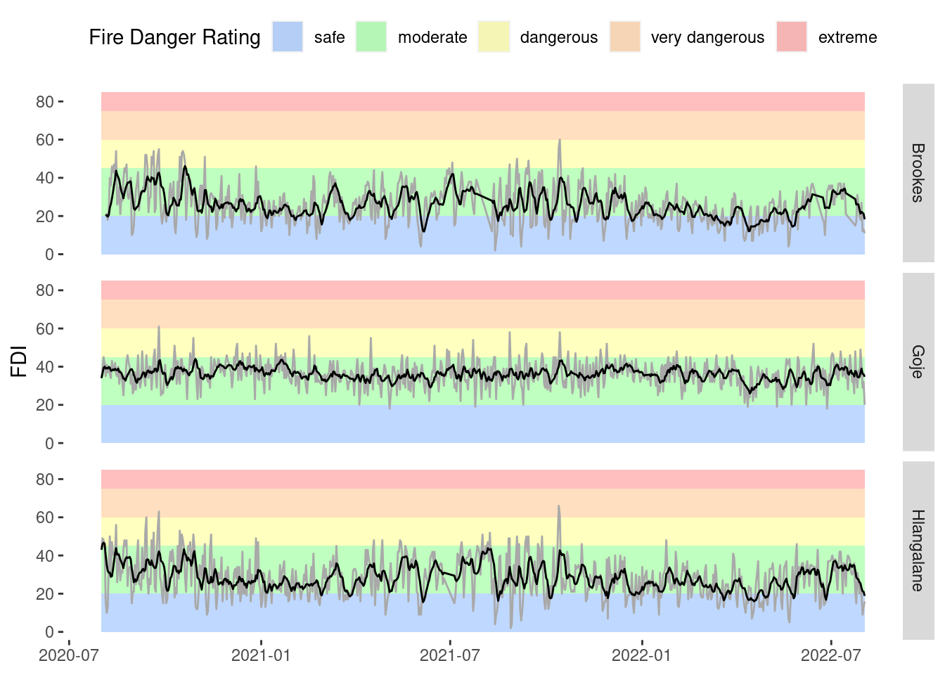 Looks good. Now we can apply fdi() to the historical weather data. The values used for temperature, humidity and wind speed are the daily averages. The results look like this: