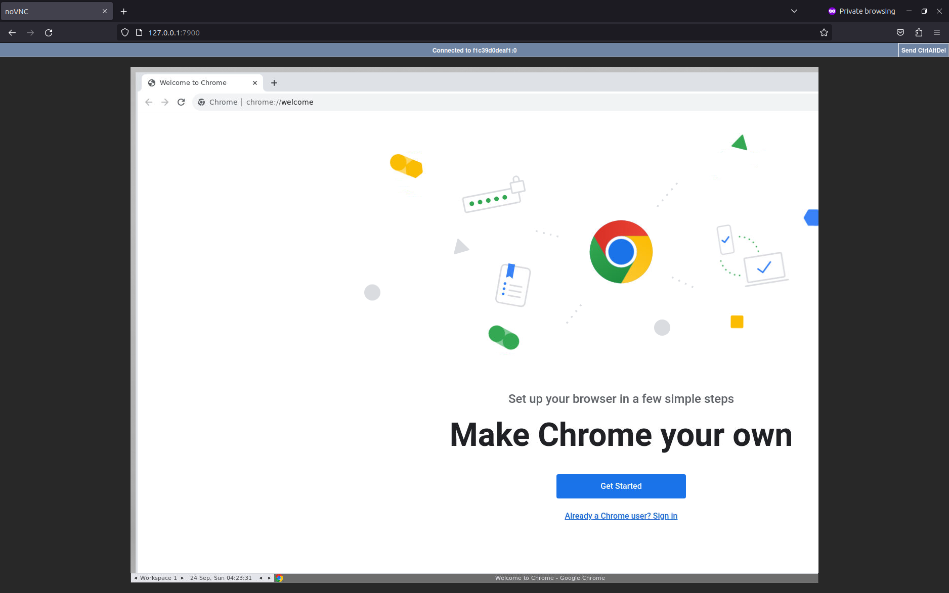 driver = uc.Chrome()You can view the Chrome session by visiting http://127.0.0.1:7900/ in your browser.