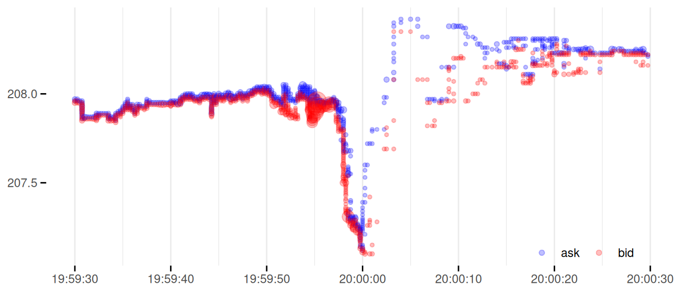 I’m not sure about the best way to present these data. Below is an example of something that I’m experimenting with, which shows the individual quotes as points. The vertical axis reflects price. The points have 25% opacity, so multiple quotes will build up the colour. The size of the points scales with the quote size. The side is encoded by colour, with bid in red and ask and in blue. I added a quotes_tidy() utility function that will transform the data into a form suitable for generating this plot.