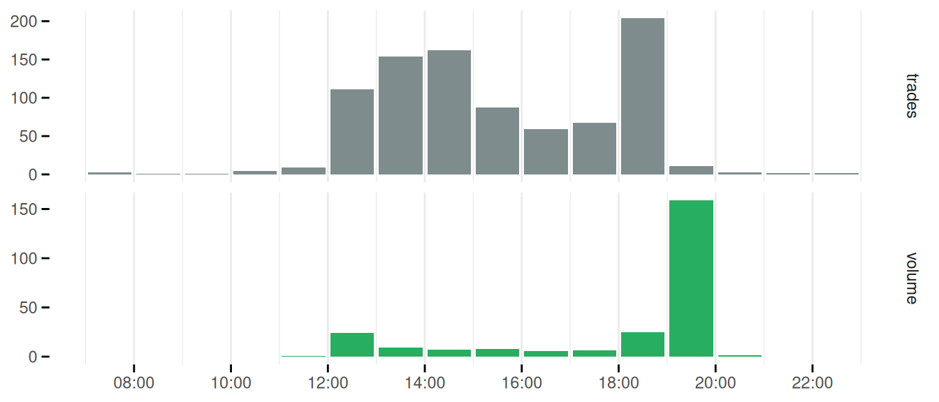 The largest number of trades occurs between 18:00 and 19:00. However, these were all relatively small trades on average. The last hour of the trading day, between 19:00 and 20:00, was dominated by a smaller number of very large trades, as indicated by the massive jump in volume.