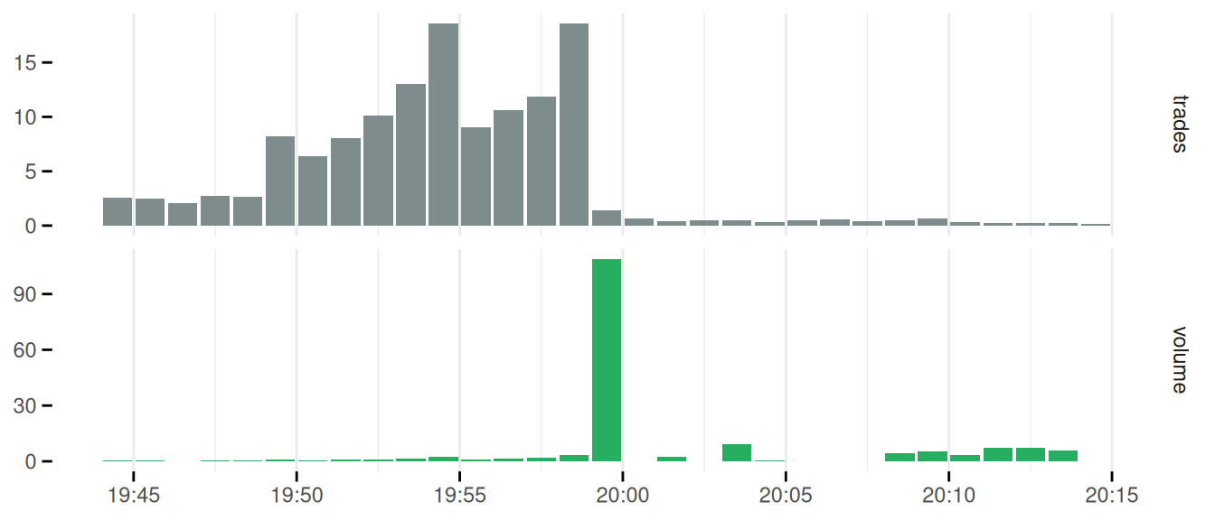 A similar pattern emerges, with the number of trades escalating until the 19:50 bar, before dropping in the 19:55 bar, where the volume peaks.