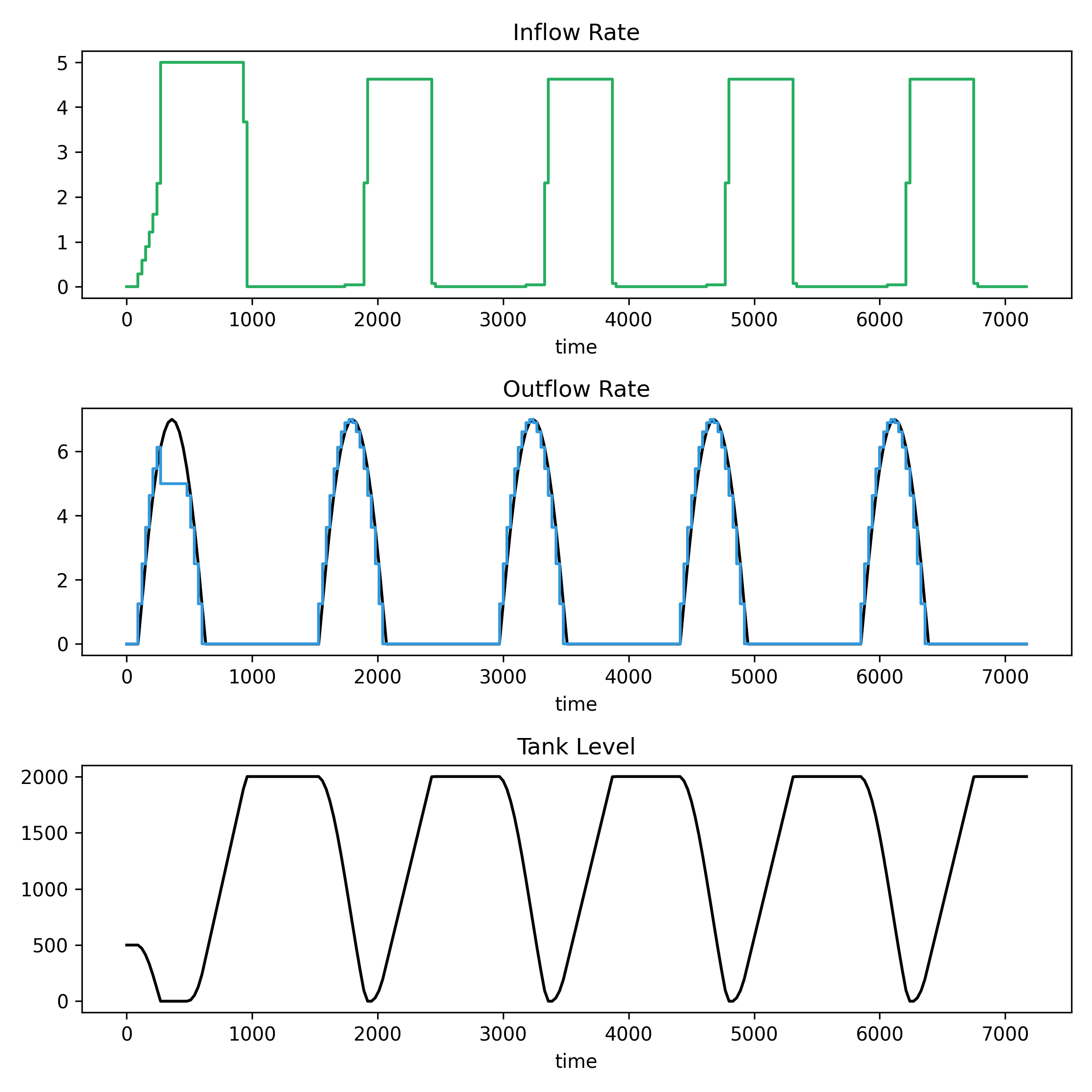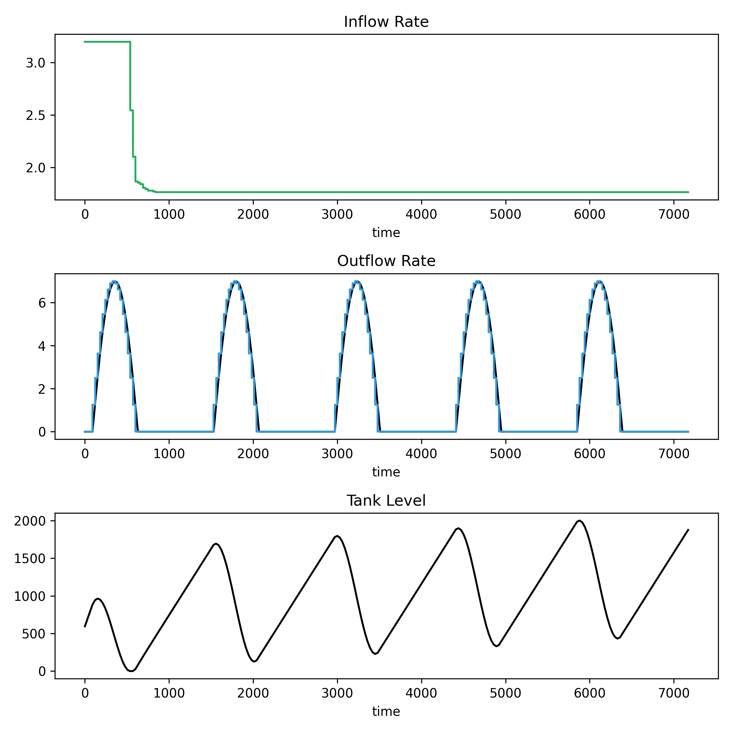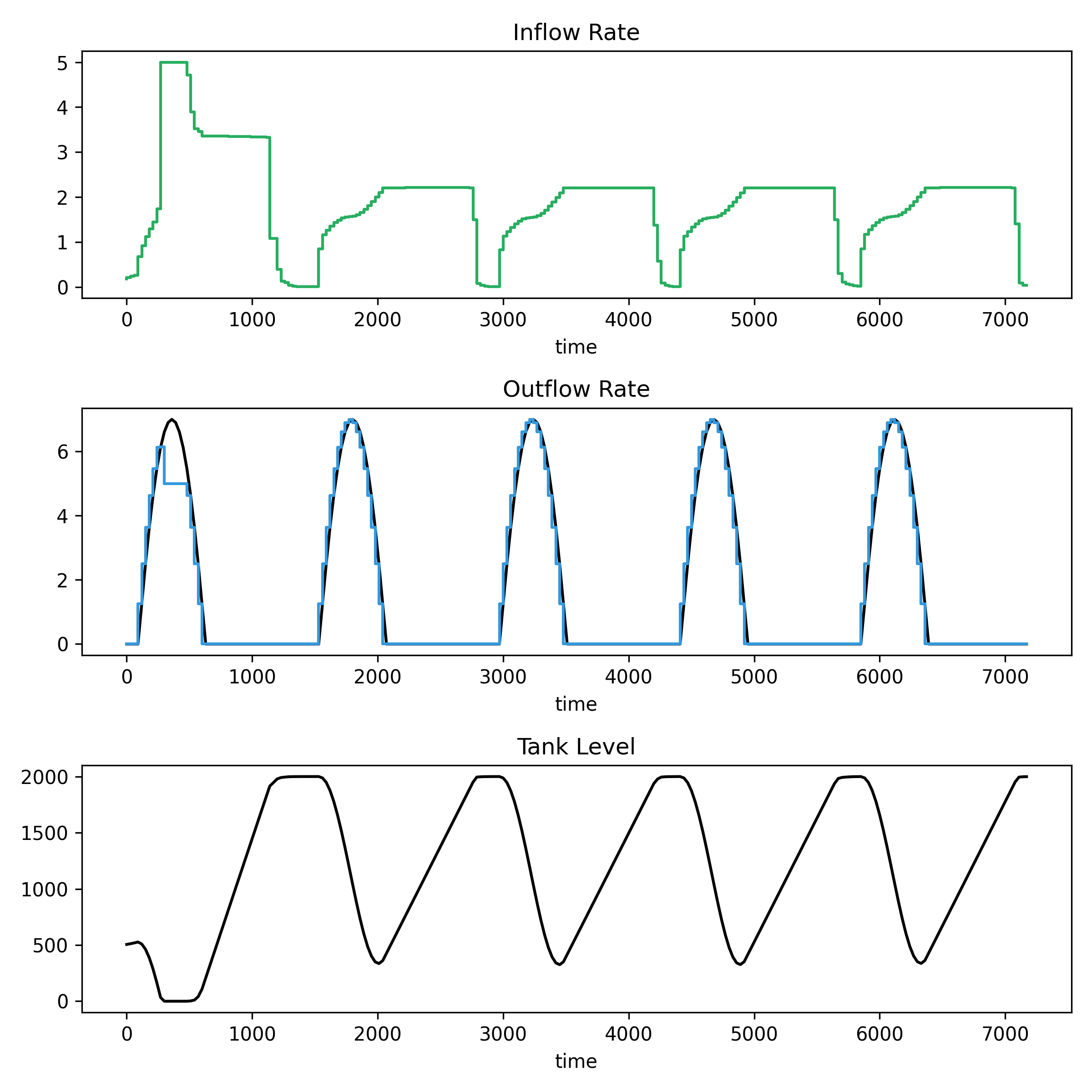 The top panel shows the inflow rate. The second panel shows the outflow rate (blue) and demand (black). The third panel shows the tank level.